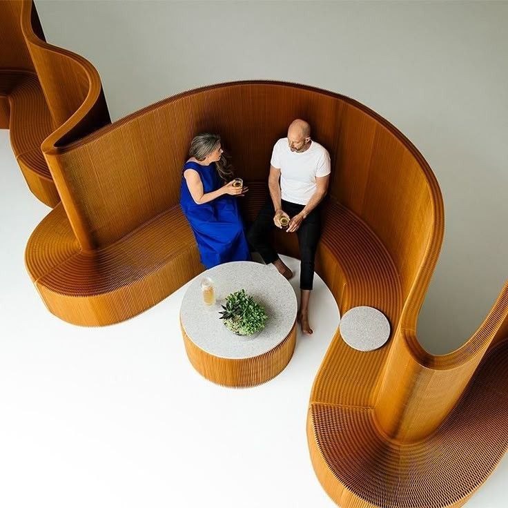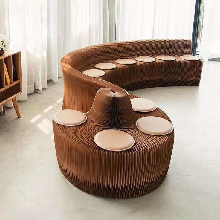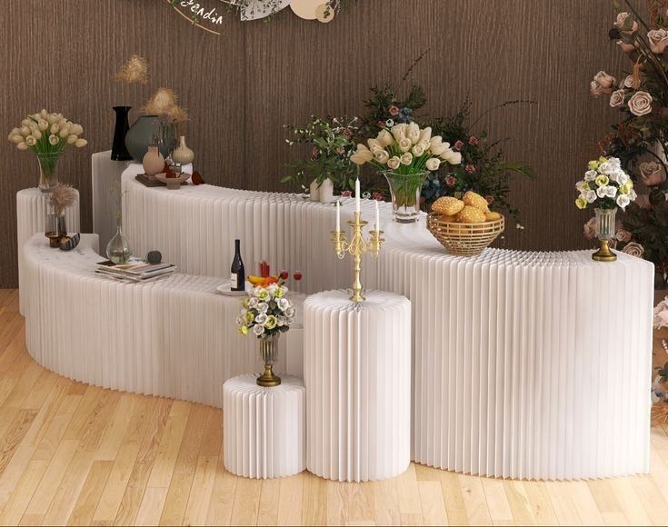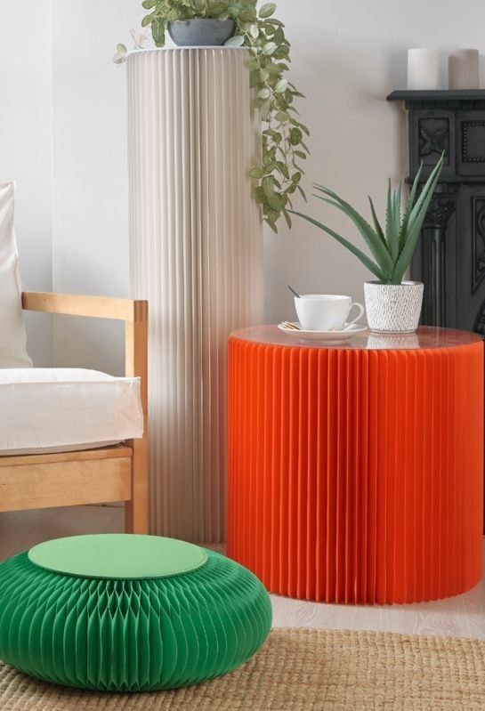 These are light and convenient paper objects that can be deployed to decorate space in a matter of moments in an original and functional way: display tables, chairs, showcases, screens and much more made of organ paper. The benefit is obvious in terms of aesthetics, it also means savings on transportation and building time. Due to the special properties of the material, the length and shape of the articles can be easily adjusted. For example, a bed can be quickly turned into a small sofa, a bench made straight, S-shaped or semicircular, and a screen can be installed around any object, creating a cozy private space.